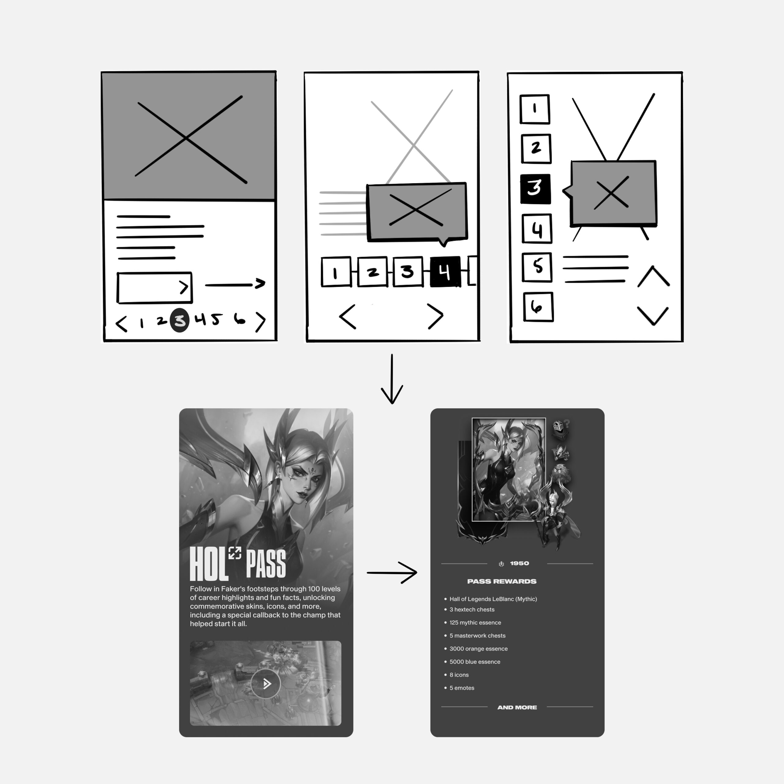 Early explorations attempted to showcase every item included in the pass, experimenting with different layouts, breakpoints, and interaction models. However, presenting 100+ rewards quickly became overwhelming, and many items were too small to warrant individual focus.